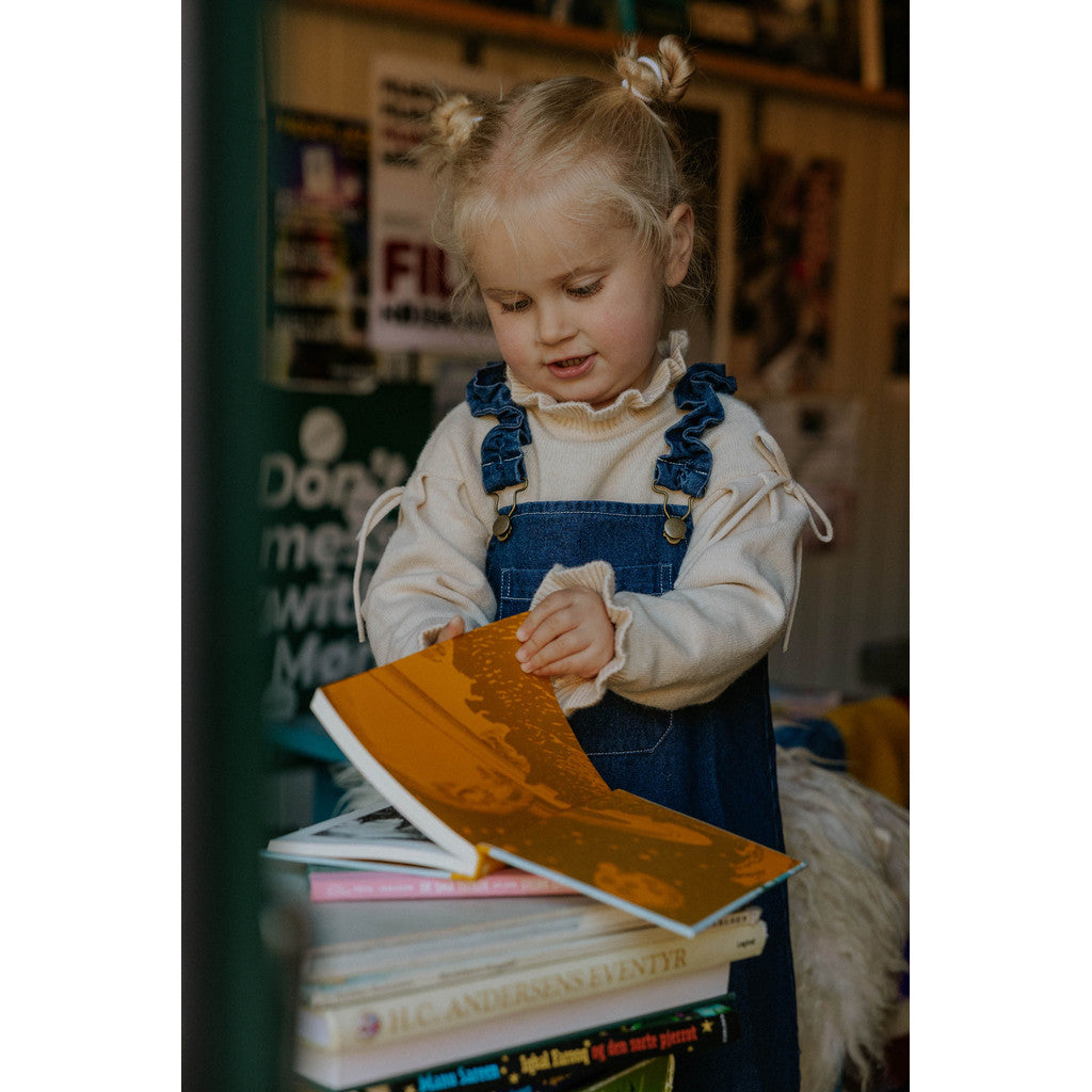 Spencer dress in denim with classic buckle closure. The dress has gathers at the straps, giving it a feminine expression. The dress has an A-line cut, making it easy for the child to move in. The dress has a small pocket at the front chest.