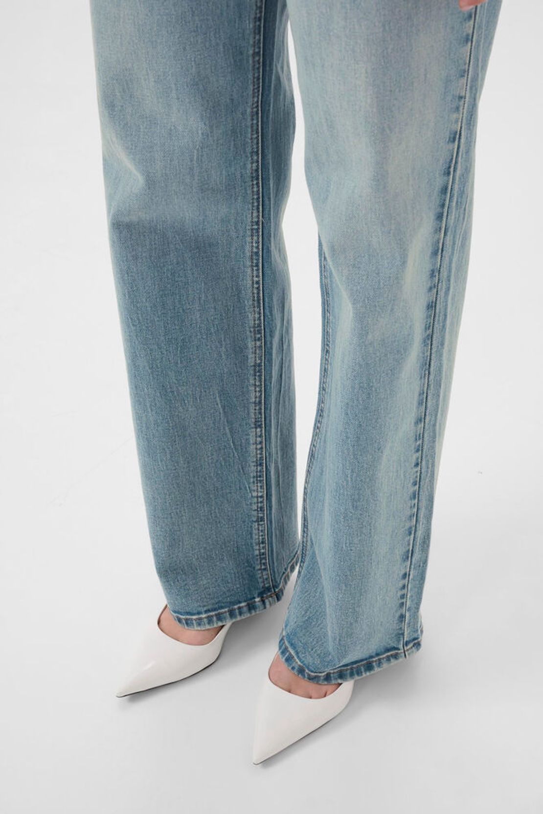 Disse jeans er store i størrelsen. Gestuz anbefaler å gå ned én størrelse. Wide leg jeans med rett, løstsittende silhuett, høy midje og klassisk fem-lommers design. Synlig struktur i denim og sikker knappelukking.