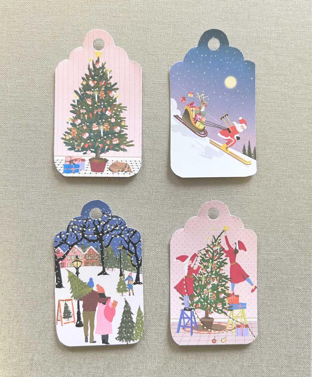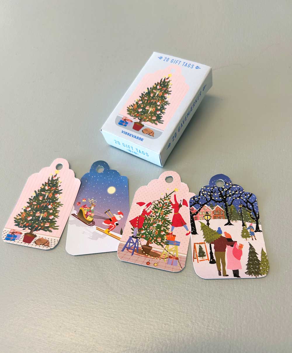 A cute little box with Gift Tags for Christmas Presents. The box contains 20 cards, 4 designs - 5 of each. Two lines at the back for writing.