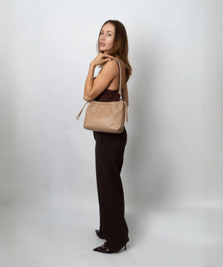 Shoulder bag with wrinkled detailing on the handle, string details and zip closure. It contains one main compartment with two small inner pockets and one zip pocket. It comes with an attachable crossbody strap.